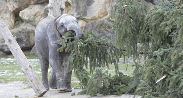 Elefanten im Tiergarten Schönbrunn freuen sich über Christbaum-Frühstück